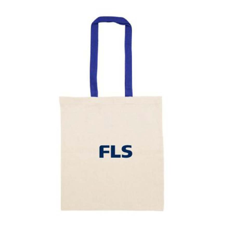 Bolsa reutilizable color natural con manijas de diferentes colores. Manijas cosidas de 70cm x 2,5 cm.
