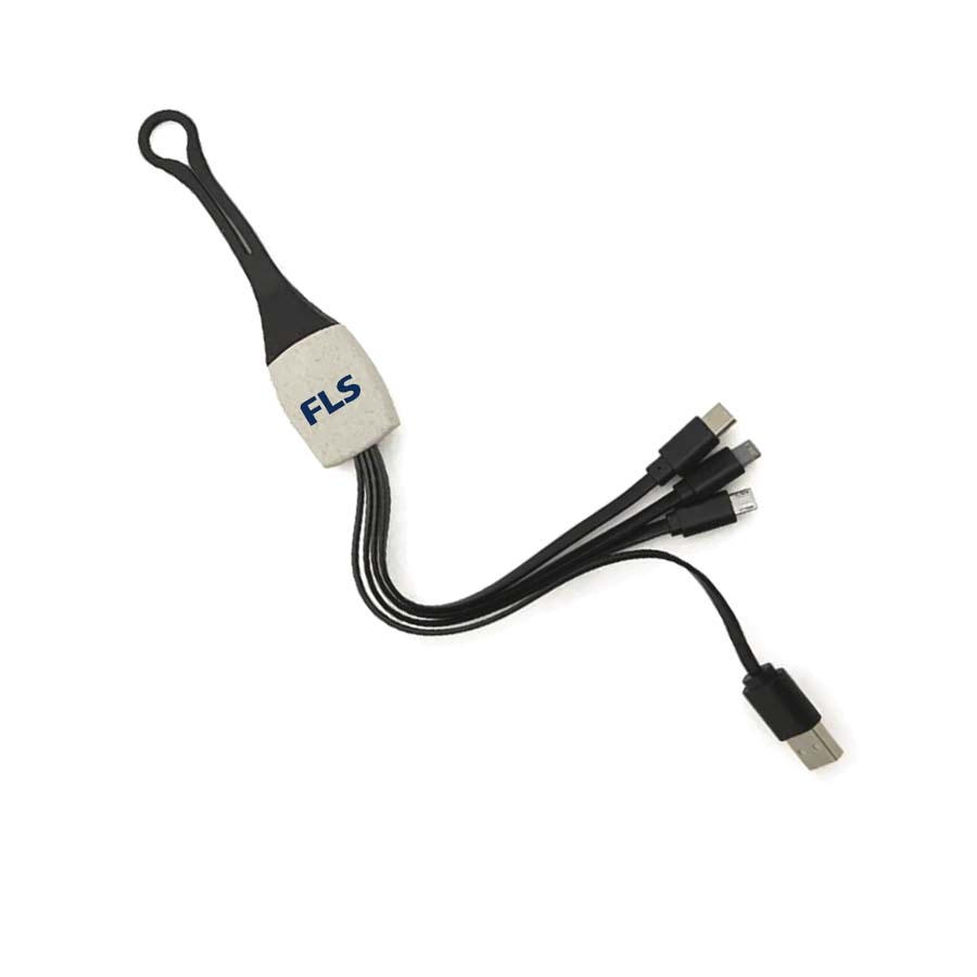 Cable 3 en 1 color negro, con una longitud de 30 cm. Es el accesorio perfecto para mantener tus dispositivos siempre cargados y listos para usar. Incluye un cable de entrada USB A y 3 de salida TIPO C / LIGHTING / MICRO B. Cuenta con accesorio rectangular de Wheat Straw, pasta de tallo de trigo, un material sustentable que reduce el consumo de plásticos vírgenes, de donde salen los cables y una cuerda de silicona.Debido a que la pasta de trigo es un material 100% natural, puede haber ligeras variaciones en el color del producto de un lote a otro.