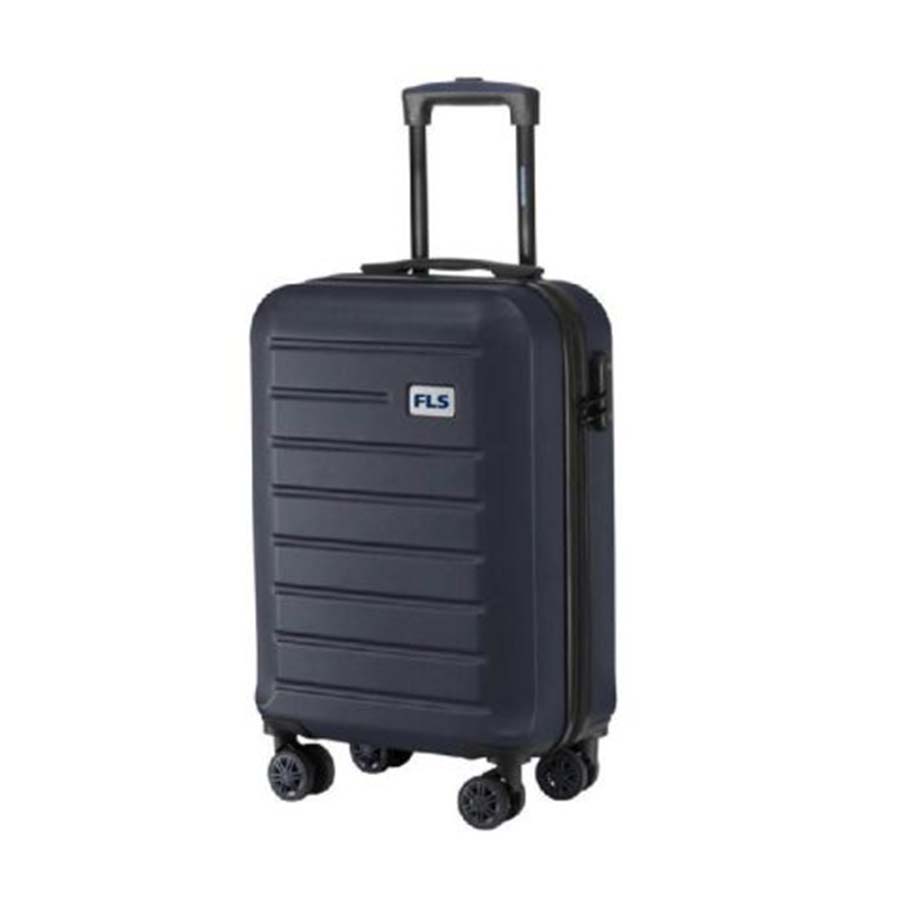 Maleta pequeña. 4 ruedas con giro 360°. Manija de transporte reforzada. Mango extensible hasta 54 cm. 2 posiciones. Interior: 2 compartimentos principales con cierre y elásticos ajustables. Placa metálica desmontable para grabado (medida: 6 x 4 cm.) Candado incluido con combinación.