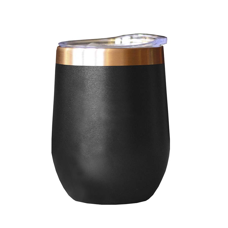 Atractivo mug metálico negro con borde color cobre. Tapón de rosca anti derrame de plástico transparente. Base antideslizante. En caja individual negra. Capacidad 300 ml.