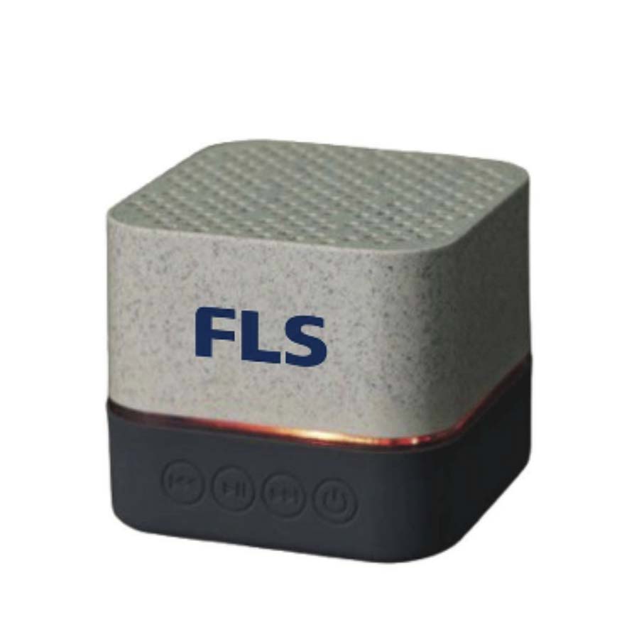 Parlante portátil con tecnología Bluetooth 5.0. Realizado en combinación de PP con Silicona y Wheat Straw, pasta de tallo de trigo, un material sustentable que reduce el consumo de plásticos vírgenes. Su peso es de 116gr, y entre sus características técnicas encontramos: Bateria de 300mAh. Poder del parlante:3W * 1. Frecuencia: 200Hz-20KHz. Conexión: 5V / 500mA. Distancia de alcance: 10 Metros. Medidas: 5,85 x 5,85 x 5,1 cm.