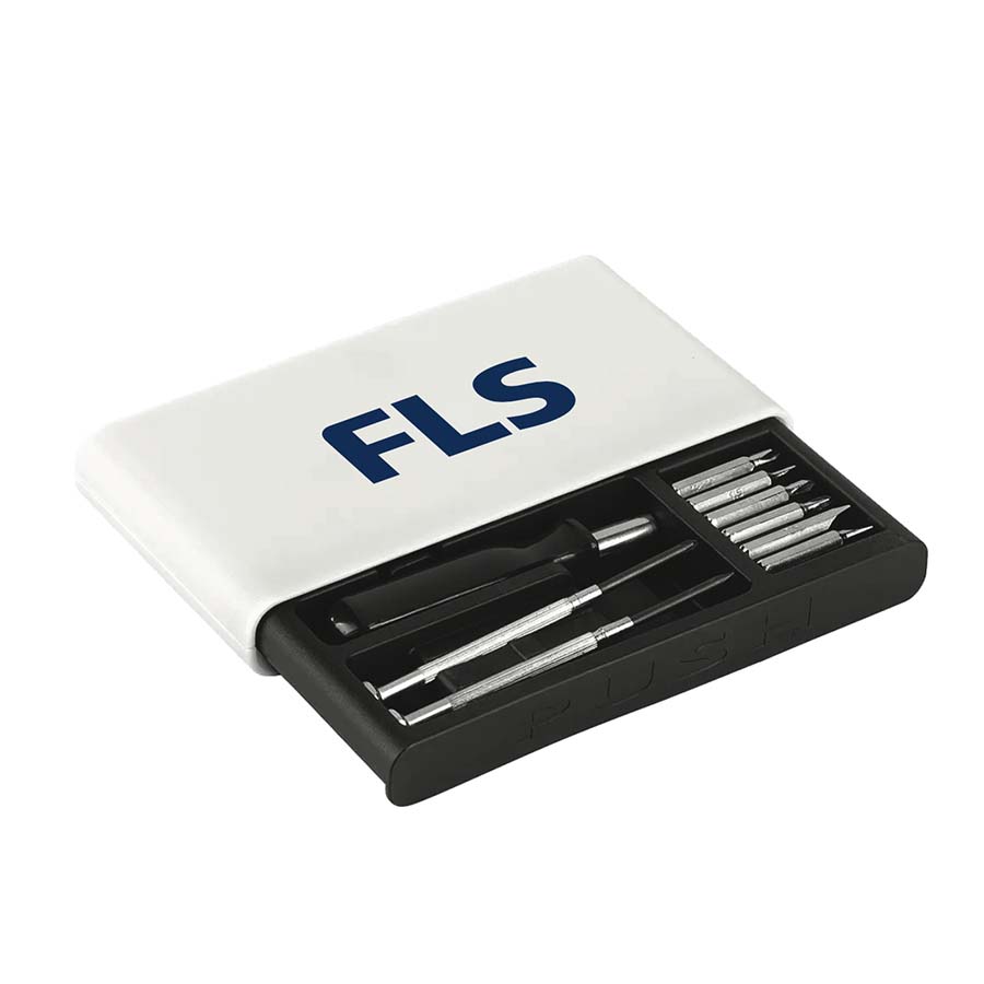Set de destornilladores. Incluye: 1 mango con punta imantada, 6 puntas diferentes (3 planas: 1,5 ; 3 y 4 mm. y 3 cruz: 0000, 0 y 1mm.) y 2 destornilladores de precisión (1 plano y 1 cruz). Base imantada que permite mantener ordenadas las diferentes puntas. Apertura push. Medidas: 7,3 x 13,7 x 2,1 cm. Materiales: ABS, polipropileno y acero. Presentación: en caja de regalo kraft