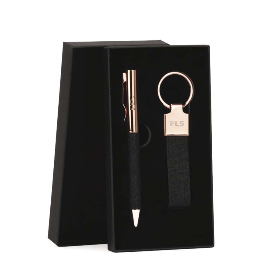 Set de Regalo, incluye llavero metálico encobrizado con lanyard de tela Oxford negro jaspeado + Bolígrafo metálico encobrizado con tela Oxford negro jaspeado, escritura negra . Presentación en elegante caja de carton color negro con tapa, interior cuna de EVA aterciopelada negra. Sobre funda de papel negro. Tamaño: Caja: 17.3 x 9.1 x 2.5 cm.